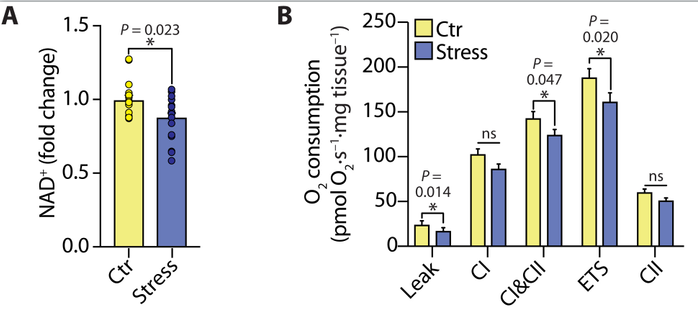 △ 受压小鼠NAc表现出NAD+水平降低、线粒体呼吸减少,且血浆eNAMPT、脂肪组织中的NAMPT水平均降低